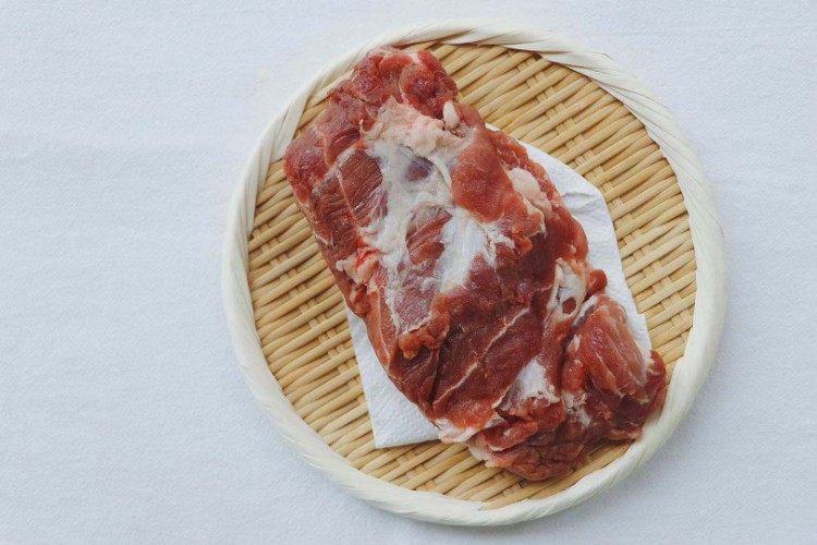 梅花肉用清水冲洗一下,然后用厨房纸擦干水分,把梅花肉用刀从中间切开,蒜也切成蒜片。