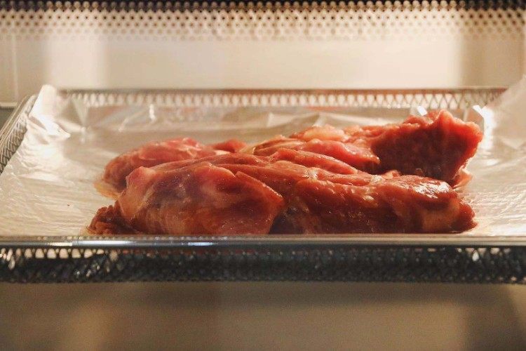 第二天把腌好的肉从冰箱里拿出来,烤箱提前预热,空气炸功能200℃,50分钟。
