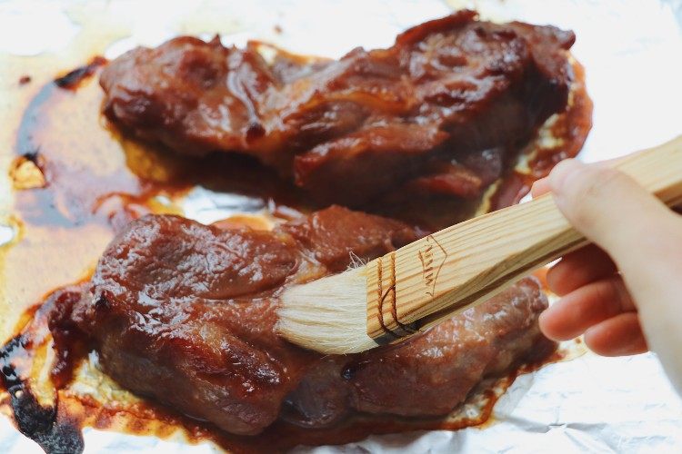 在烤制的过程中我们准备蜂蜜水,蜂蜜和水的比例2:1混合均匀,间隔10分钟左右我们就把烤盘端出来刷上一层蜂蜜水,为的是上色增亮,然后烤到25分钟的时候给肉翻个面。