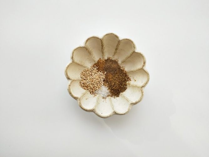 准备好调味:盐,白糖,五香粉,花椒粉,黑胡椒粉,孜然粉和孜然粒以及白芝麻。