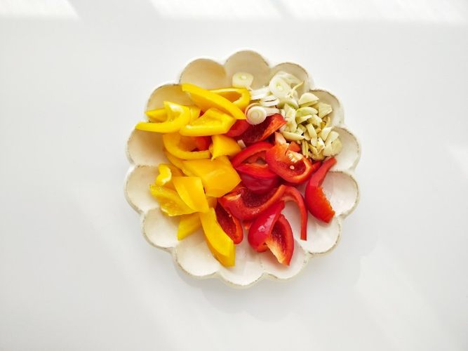 将红黄彩椒切成大小相同的块,姜葱蒜切碎。