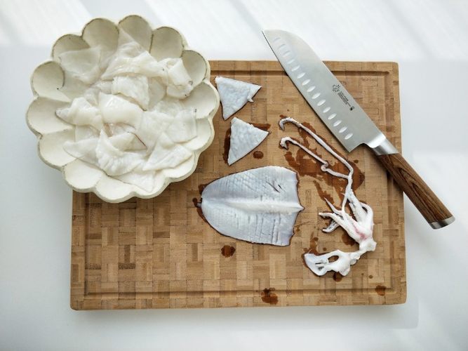 将墨鱼清洗干净,把外表的膜撕净,挤出尖嘴去除眼睛,用三德刀给墨鱼全身切花刀,再切成三角块。