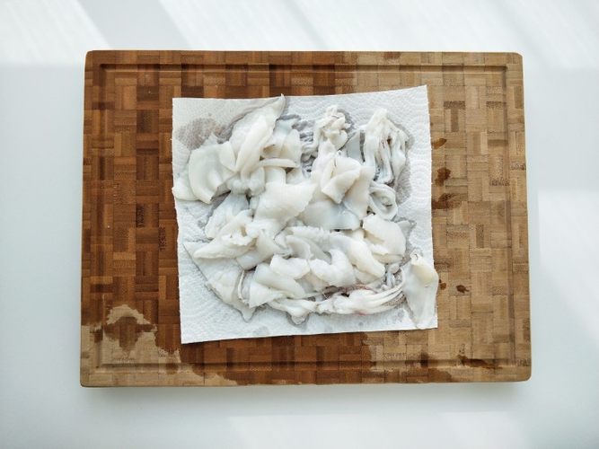 接着用厨房纸吸干墨鱼水分,时间允许尽量一片一片吸干。