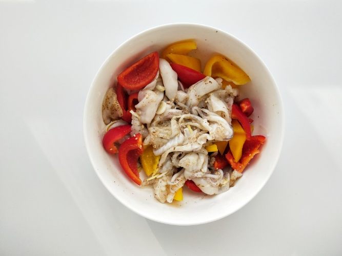 准备一个大碗,将墨鱼,红黄椒以及全部调味料倒入大碗中。