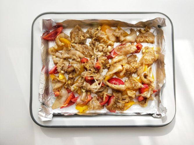 预热烤箱的同时烤盘铺上锡纸,刷上薄油,将搅拌好的孜然墨鱼平铺在烤盘中,尽量不重叠。
