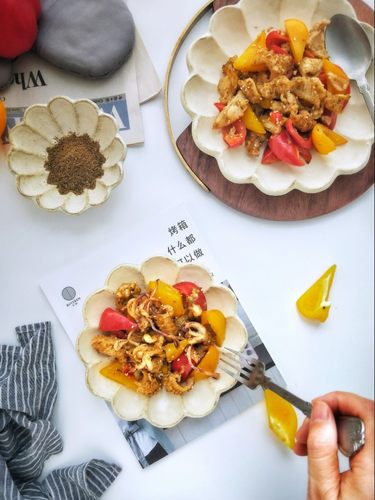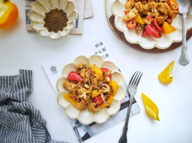 将烤盘放入烤箱中层,空气炸20分钟,期间红黄彩椒会烤出汁水可以取出烤盘倒掉,加烤5分钟。~烤制的时间可以根据各家烤箱脾气以及个人口味来。