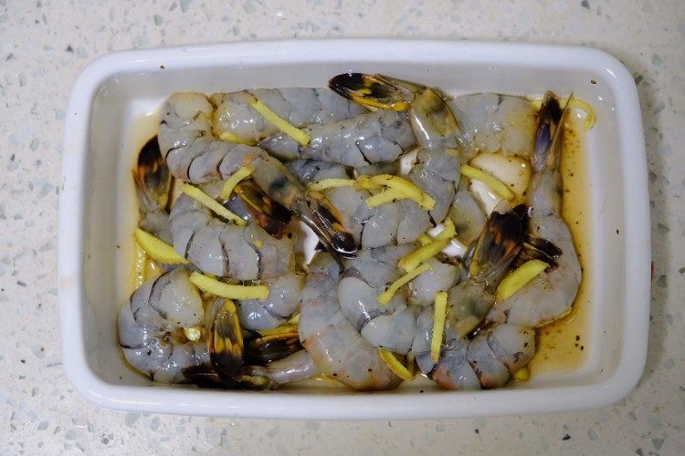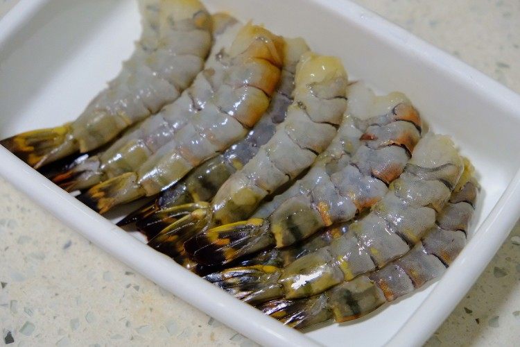 黑虎虾洗净后去虾头虾线,剥去虾壳,保留虾尾。