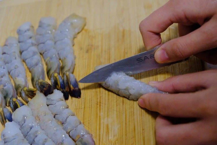 用小刀在黑虎虾腹部等分轻划3刀,轻拍虾背,保持虾身笔直。
