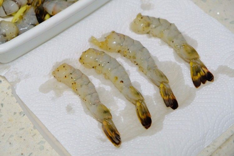 腌制后用厨房纸吸去黑虎虾多余水分。