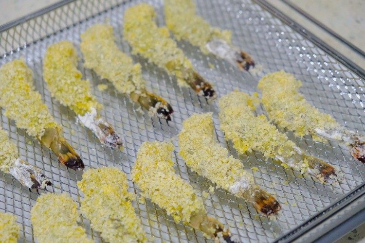 将裹制好的黑虎虾平铺入烤网,放入预热好的烤箱中即可。