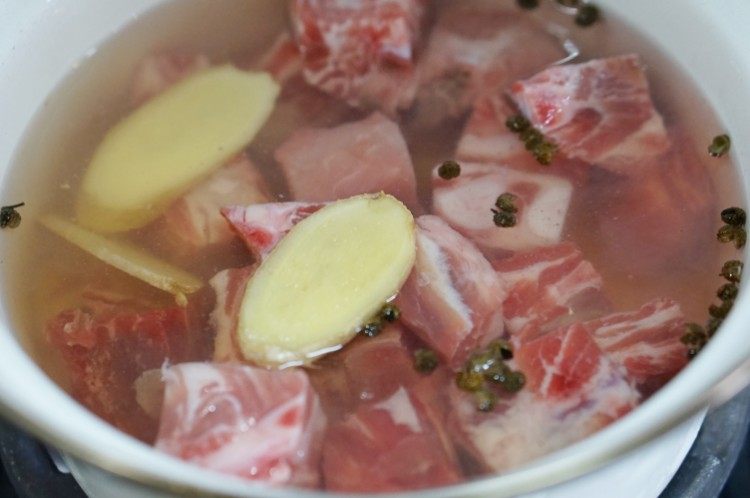 排骨洗去血水,冷水下锅,放姜3片、八角、香叶、料酒汆熟捞出。