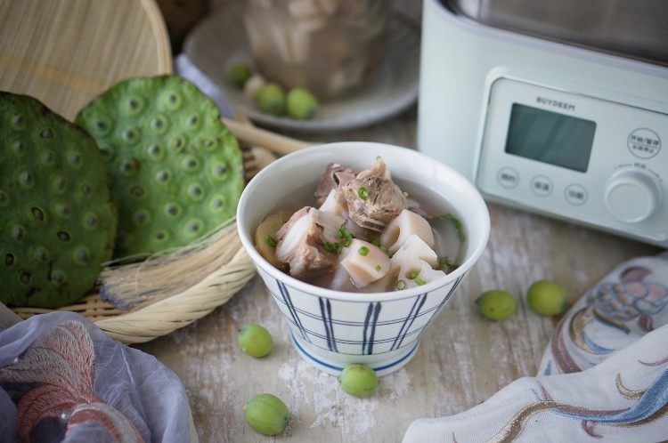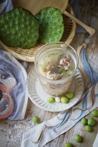 莲藕和汆好的排骨放入炖盅,加剩余的姜片、花椒粒,开水没过食材。