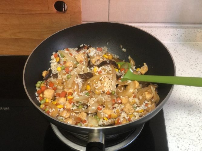 2、不需要加过多水,炒过的食材含有汤汁,提前浸泡的大米也吸收了水分。