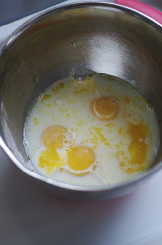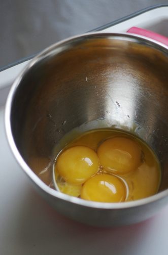 蛋黄和蛋清分别放入两个无油无水的不锈钢盆里。