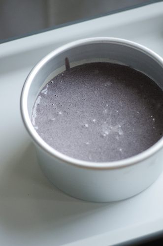 最终混拌好的米糊表面呈光滑细腻状态即可,将米糊倒入六寸加高模具,轻轻震一下,去除气泡。