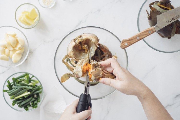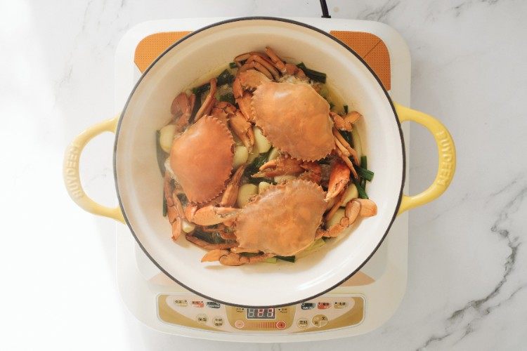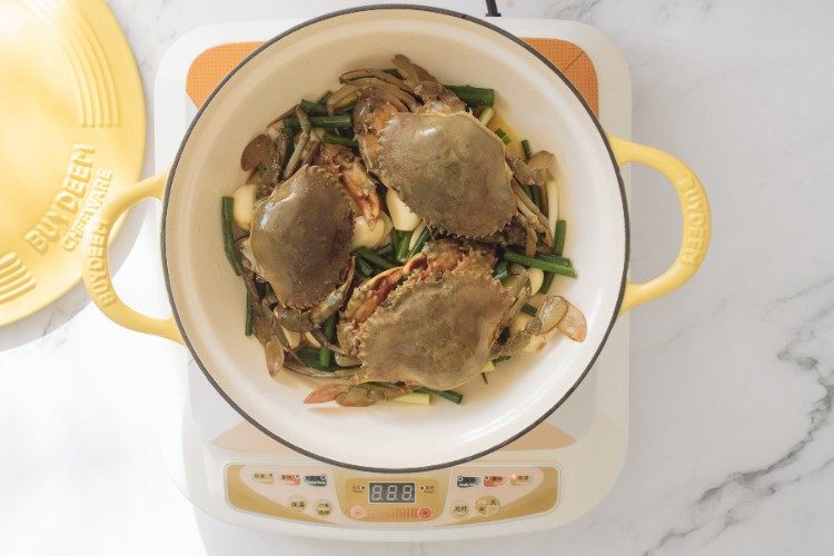 螃蟹处理干净,葱切成段,姜切片。
