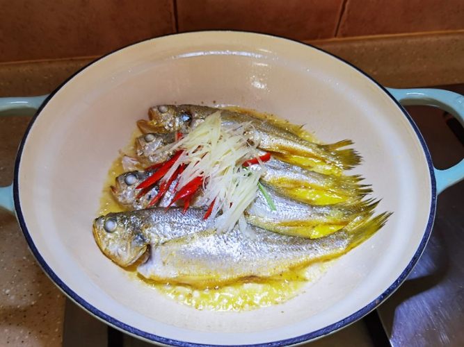 把腌制好的小黄鱼平铺在北鼎海鲜锅里,盖上盖子中火加热2分钟后揭盖放出腥气,同时撒一点白胡椒粉在鱼身表面,依次在鱼上放姜丝和红椒丝,盖上锅盖,小火继续焗3分钟。