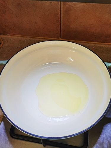 锅内放入15克花生油,均匀地涂满锅底,开火加热。