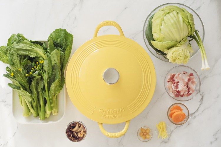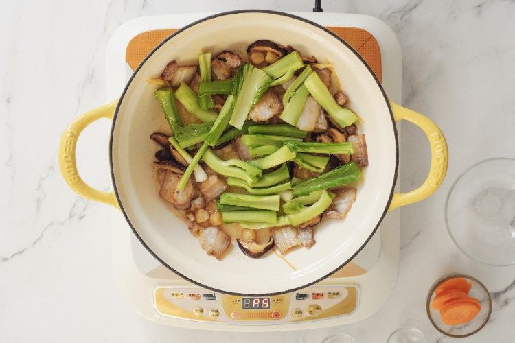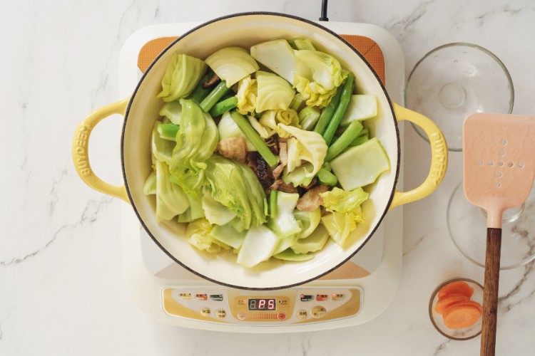 加入大菜,炒匀后,盖上盖子,中火焖煮8分钟。