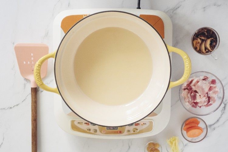 准备材料(所有菜洗干净切小,姜切丝,香菇洗干净泡发切成条(泡发香菇的水留着备用),干贝泡发,胡萝卜切片)。