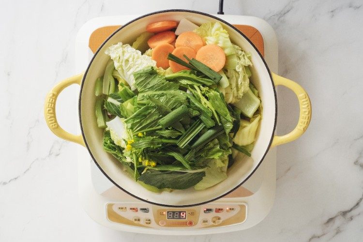 加入菜叶和胡萝卜,焖煮5-8分钟,按喜好加入盐和鸡精即可。