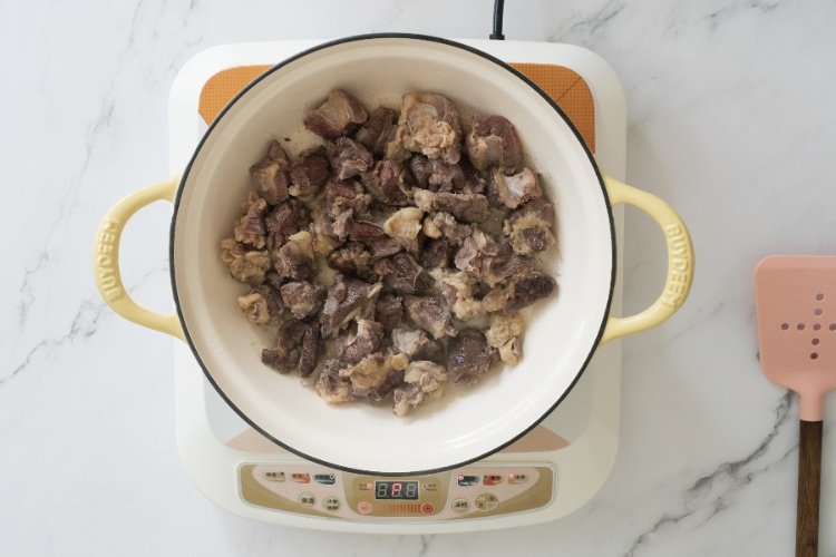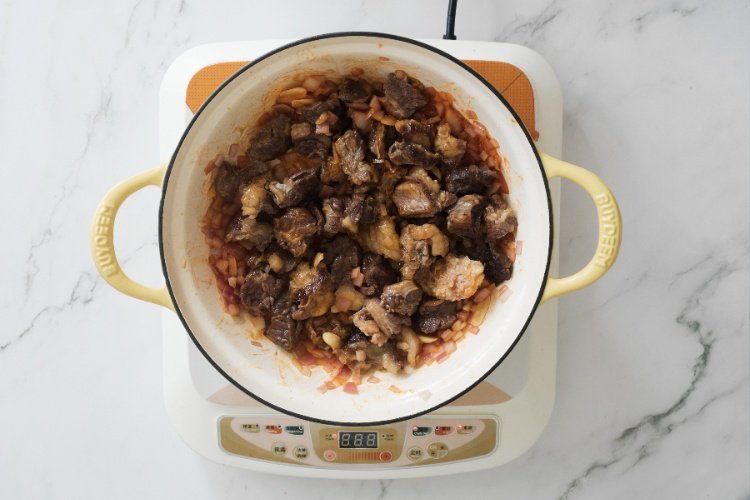 锅内放少许油,烧热,将牛腩放入锅中,小火煎至焦黄,捞起备用。