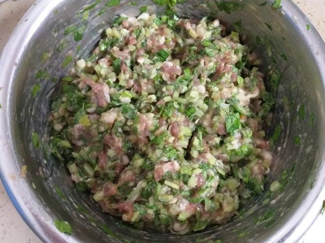 除芹菜碎外的猪肉馅原料放入盆,用筷子朝一个方向拌匀,再加入芹菜碎拌匀待用。