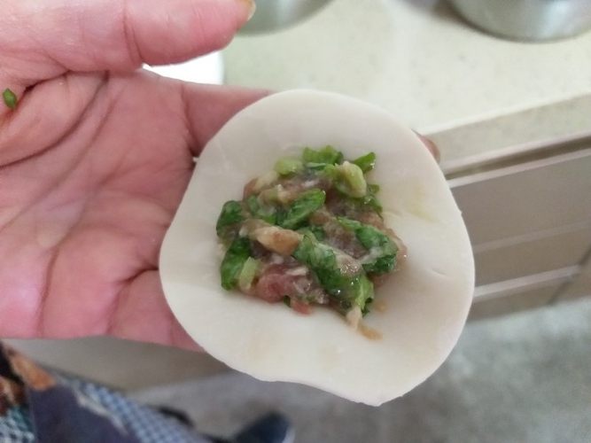 取一张饺子皮,四周抹点水,放入馅包成饺子状。
