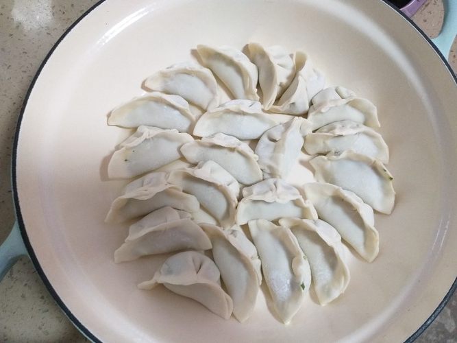 焖炖锅上加入2勺色拉油,整齐码上饺子,加入纯净水没过饺子1/3处,表面再淋1勺色拉油。