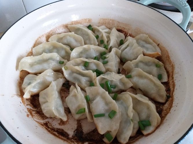 15分钟后去盖铲动饺子,底部已经呈现金黄色,这时候加入葱花即可起锅食用。