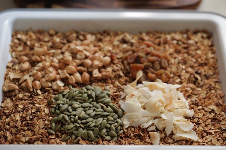 自制考麦片的好处是可以按自己的喜好添加配料,拌一拌就放去烤,可以说是非常简单也不会翻车的,除了搭配酸奶,还可以泡牛奶,空口吃也很好吃。最近快过节啦,烤一些装在漂亮的罐子里,用来当伴手礼也是很不错哒。