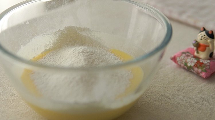 将20g玉米淀粉30g低筋面粉筛入搅拌好的蛋黄糊中,用画一字的手法搅拌至无干粉状态