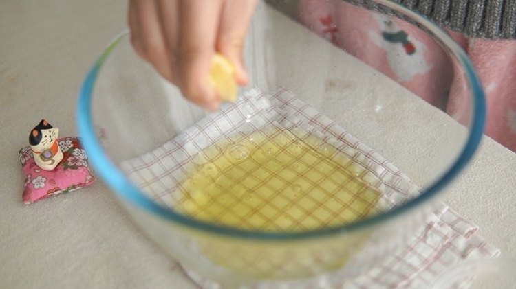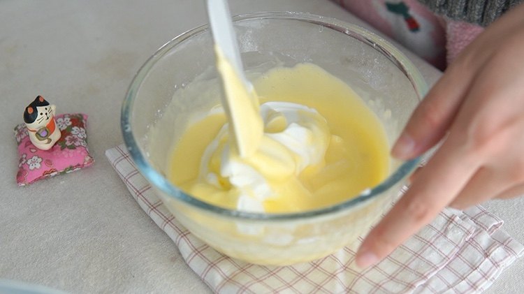舀出1/3之一的蛋白霜到蛋黄糊中,用刮刀翻拌均匀