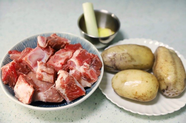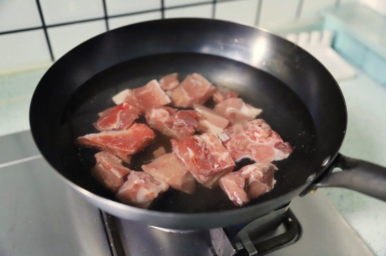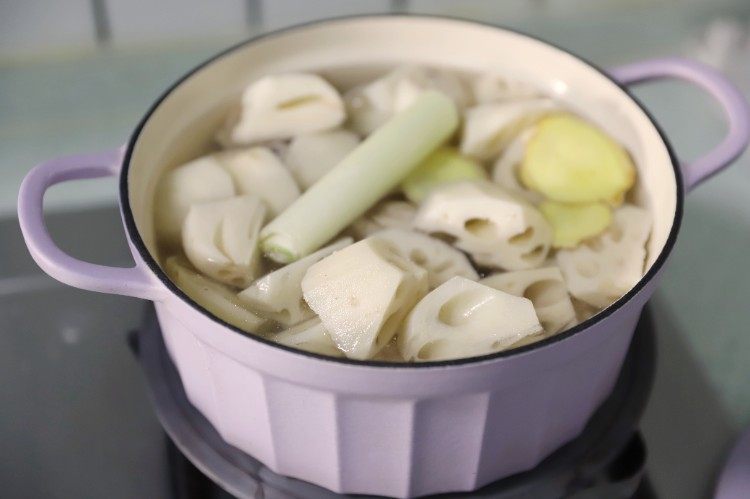 将焯水后的排骨、莲藕和葱段、姜片放入锅中,再倒入清水没过食材