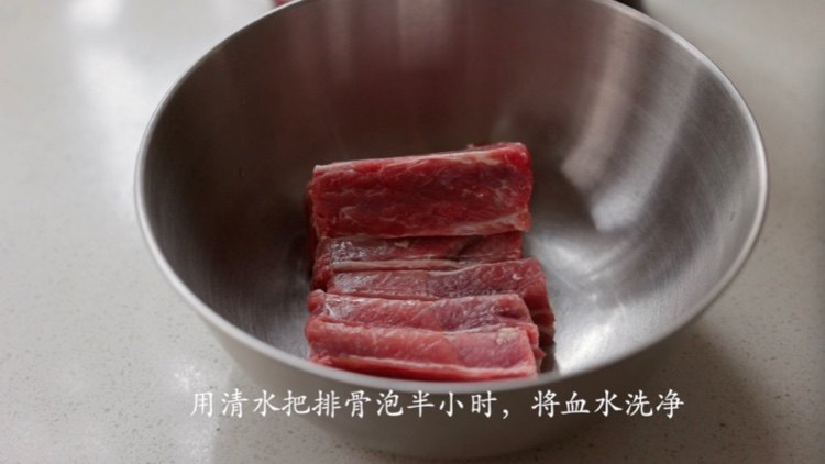 新鲜排骨用清水浸泡半小时,泡出血水洗净并擦干水分。