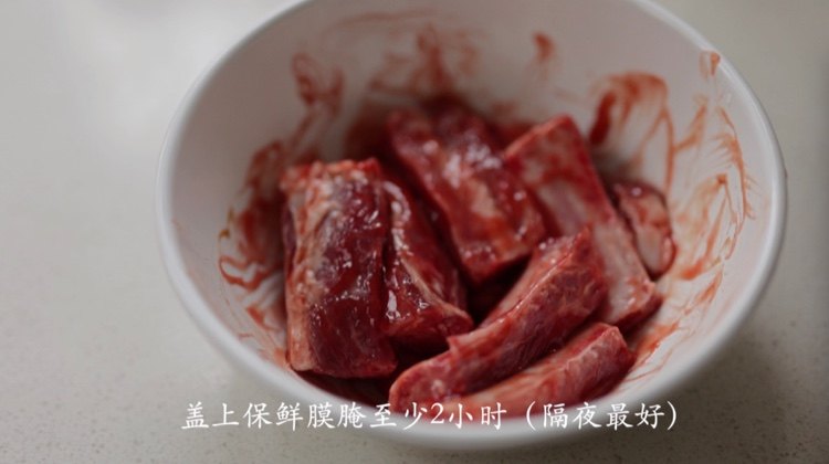 倒入叉烧酱和蚝油,抓匀盖上保鲜膜腌至少2小时,有时间最好放冰箱腌一夜。
