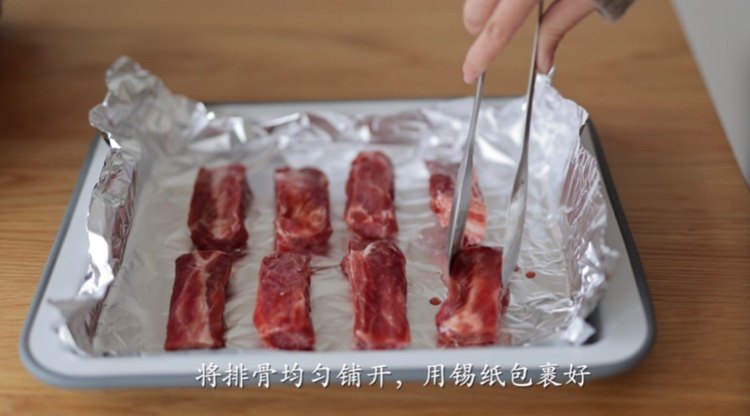 排骨均匀摆在烤盘上,用锡纸包好,烤箱烹饪烤180度40分钟。