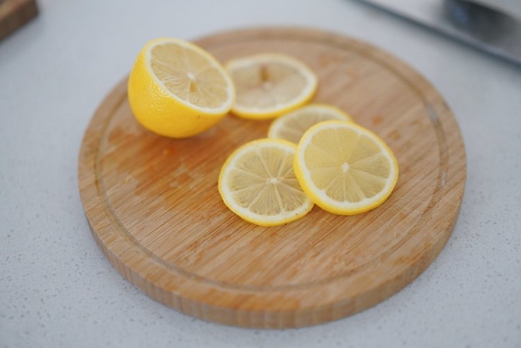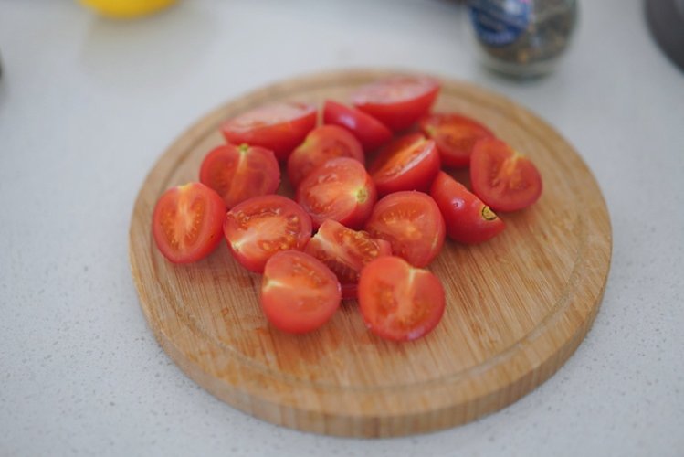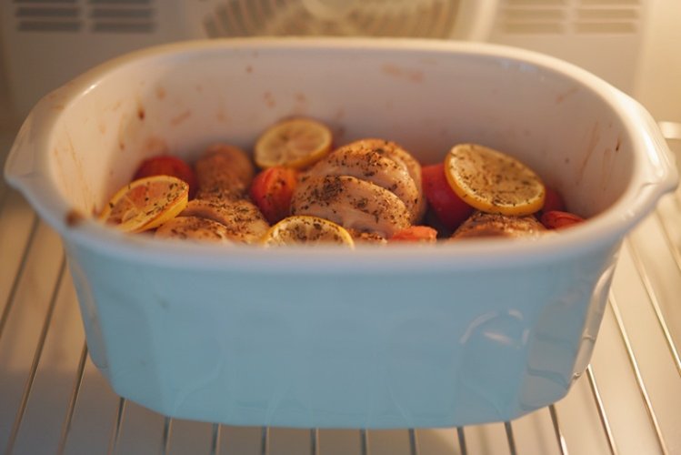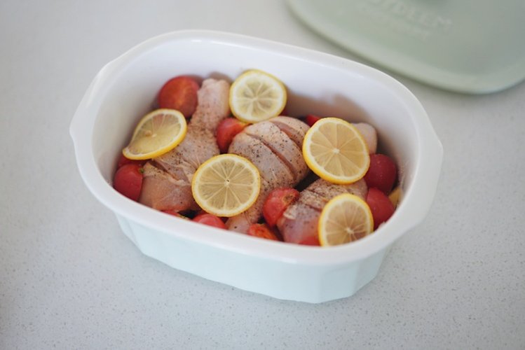 腌制好的琵琶腿放在配菜上,放入小番茄、柠檬片,撒上罗勒碎