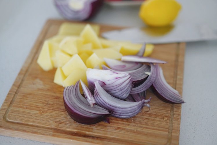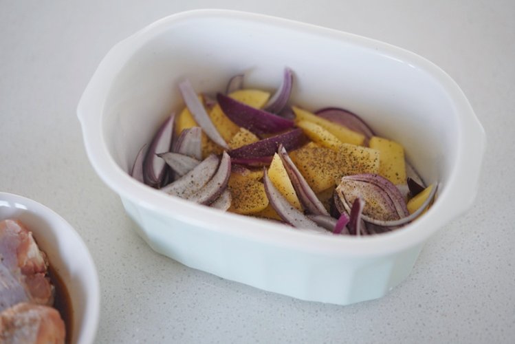 将土豆和洋葱放入大炖盅内,加黑胡椒、橄榄油搅拌均匀