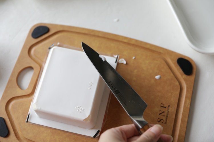 内酯豆腐盒子倒扣,切掉四角边边,就可以轻松脱模了