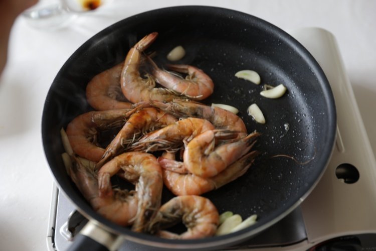 放入鲜虾翻炒,倒入少量生抽,盐翻炒变色后关火