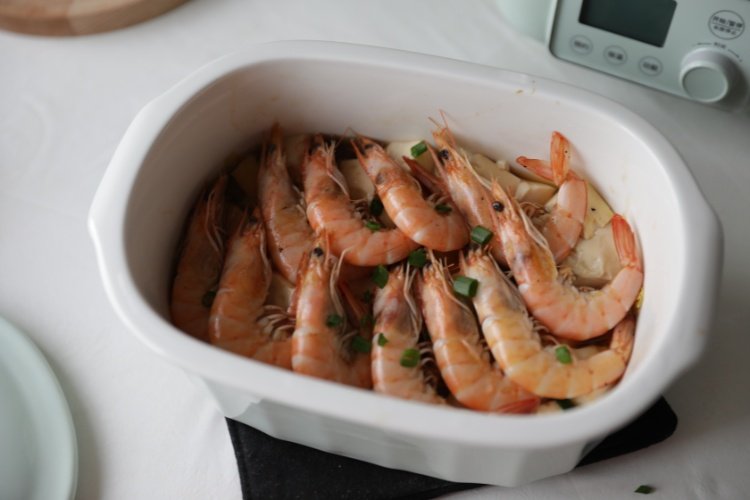 把炒好的虾铺在北鼎炖盅最上一层