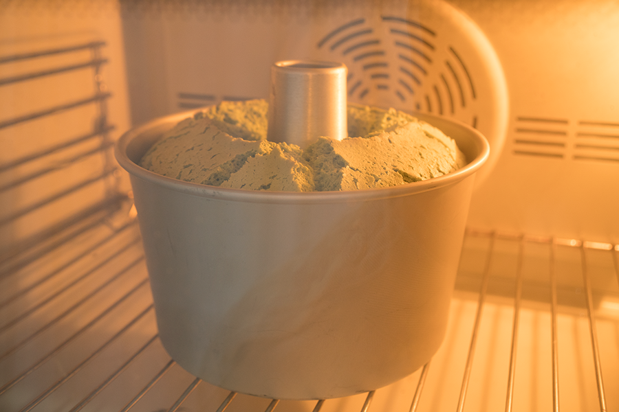 将蛋白与蛋黄糊翻拌均匀,倒入模具中;轻震两下模具,放入烤箱中下层;