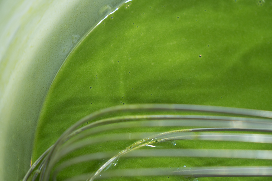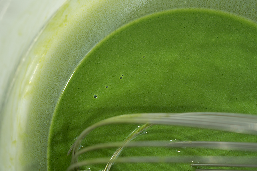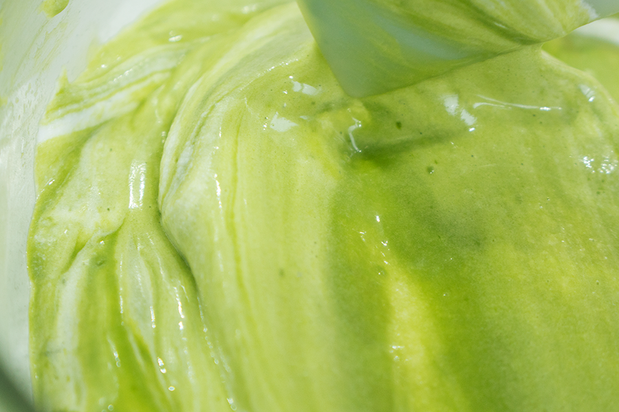 混合牛奶与抹茶黄油,搅拌均匀;再加入蛋黄,搅拌均匀;