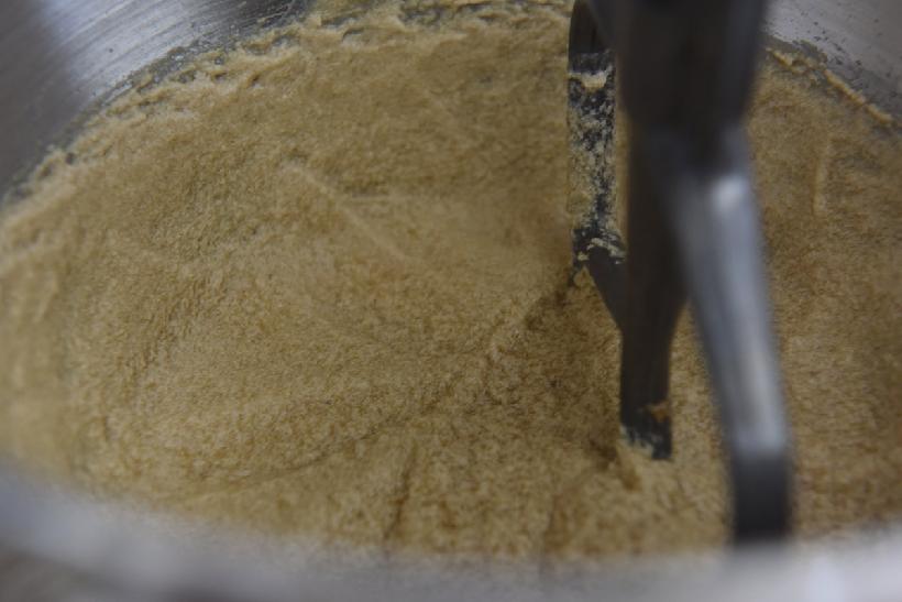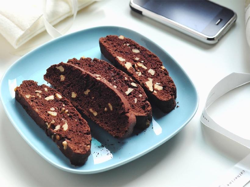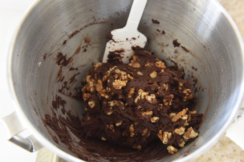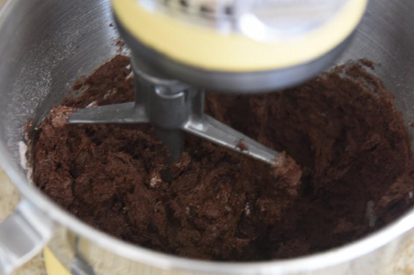 中筋面粉、可可粉和泡打粉混合后一并筛入,慢速搅拌至看不见干粉;不要过度搅拌,面粉出筋饼干会硬。