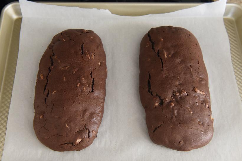 面团分两份,搓成两个圆条,放在烤盘上按扁。大约8厘米宽,2厘米厚。