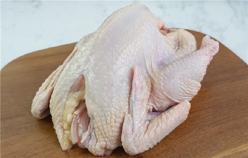 取出腌制好的鸡,鸡背朝上。用家禽剪从鸡的脊椎骨两边剪开,把脊椎骨连鸡脖一起去掉;接着将鸡翻转过来,鸡胸朝上,展开两边。此时鸡胸部分仍会隆起,用手掌用力按压使鸡胸软骨断开,摊平;