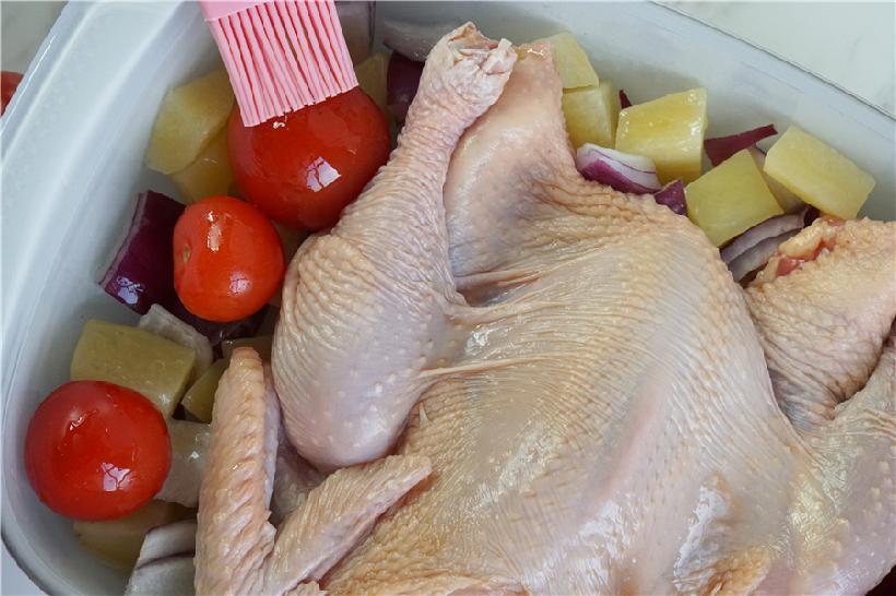 1、鸡的大小决定了酱料的分量和烘烤的时间。如果你的鸡只有一半的大小,就可以只用10ml生抽和5g左右的海盐;烘烤时间也可以缩短到全程半小时左右;