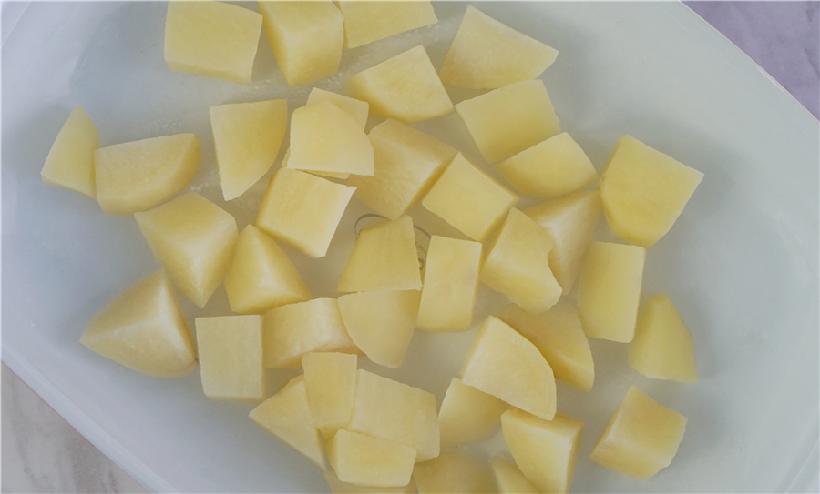 2个土豆切块(大小适中),用沸水焯熟,沥干备用;洋葱切小块(不要太碎)备用;