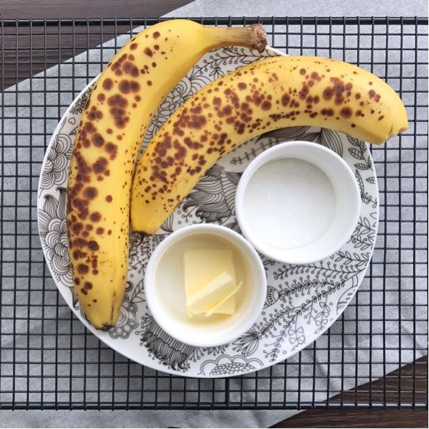 首先花几分钟预备焦糖香蕉夹心和后面要用的焦糖浆。香蕉要用这种熟透带芝麻点的才香甜糯,皮太青太硬的就不行;